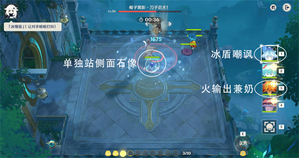 4、刀子狗闪现2次,且去往右上聚怪,冰灵蕈站在石像侧边放战技嘲讽;