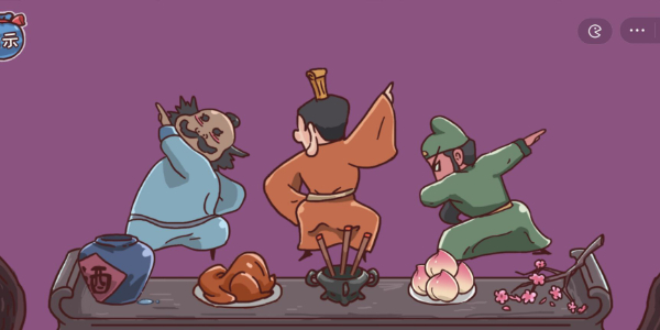 2、将桌子上的桃子放入刘备和关羽碗中。