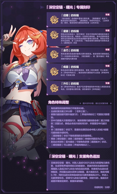 角色的雷元素伤害增加,使用【晴空霹雳】技能可激发两次【界域共鸣标记】,成功触发极限闪避技能可回复【界域共鸣标记】的激发次数。