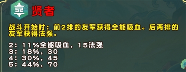 1. 前两排友军享受全能吸血加成,后两排则获得法强加成。